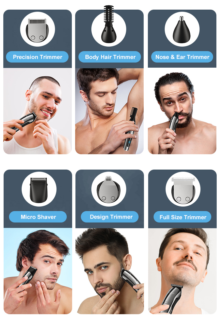 Say goodbye to cluttered countertops and a drawer full of tools! This multi-functional grooming kit is your complete personal stylist, designed for a total image refresh. It's not just a simple hair clipper—with six professional, interchangeable heads, it precisely addresses every single grooming need:U-blade clipper,T-blade detailer,engraving blade,foil shaver,nose & ear brimmer,body groomer.